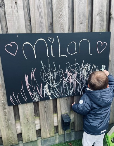 Hier is t krijtbord ook een succes, kan hij zich op uitleven met stoepkrijt ...