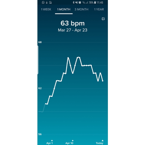Ik zie dat hij nu gemiddeld 9 a 10 slagen per min hoger is. Ben nu net 4+4 ...