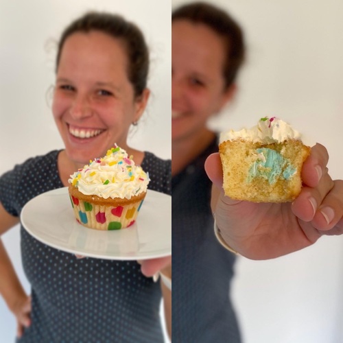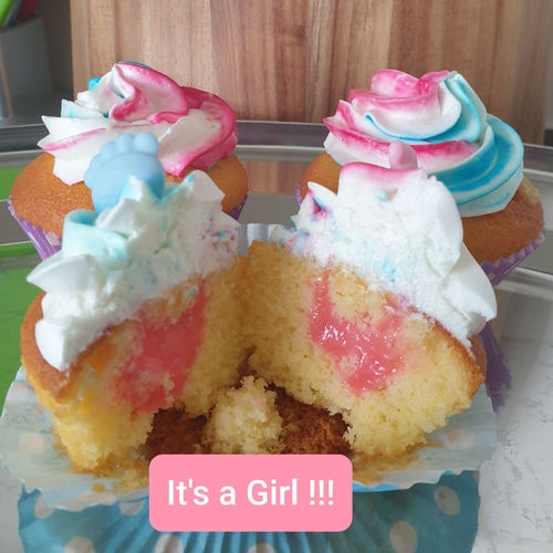 Wat ook leuk is om de cupcakes alle 2 de kleuren te geven 1 roze en 1 blauw iedereen 1 hap nemen en dan tellen de meeste kleur dat wordt het zo maak je er ook een spel van en betrek je iedereen er bij