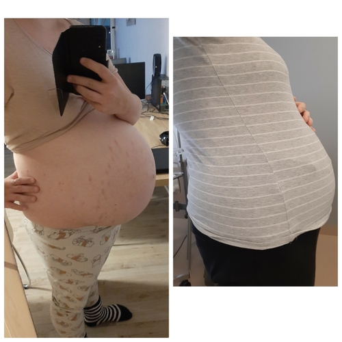 Nu 3 weken later zit ik weer op mijn gewicht van voor de zwangerschap. Ik was bijna 40kg aangekomen, hield heel veel vocht vast. Ik val nu bijna teveel af.. ik heb nog nooit zulke dunne beentjes gehad als nu. Komt waarschijnlijk ook door het geven van borstvoeding. Alleen mijn buik is nog wat boller, net alsof ik 12 weken zwanger ben.