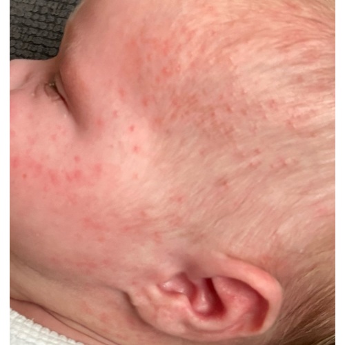 Veel krampjes, scheetjes, diarree, benauwdheid, af en toe piepend ademen, lijkt verkouden, heel veel rode bultjes op gezicht en rode plekken op haar hoofdhuid en in nek ik denk eczeem, veel bubbelen/spelen met speeksel. Ze heeft daarnaast ook last van verborgen reflux dus het eten komt er niet uit...