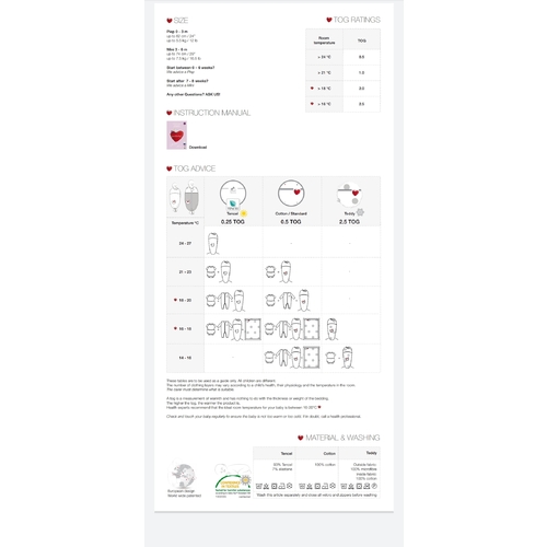 Op de website van Puckababy staan deze handige overzichten. Voor de bakerzakken en slaapzakken.