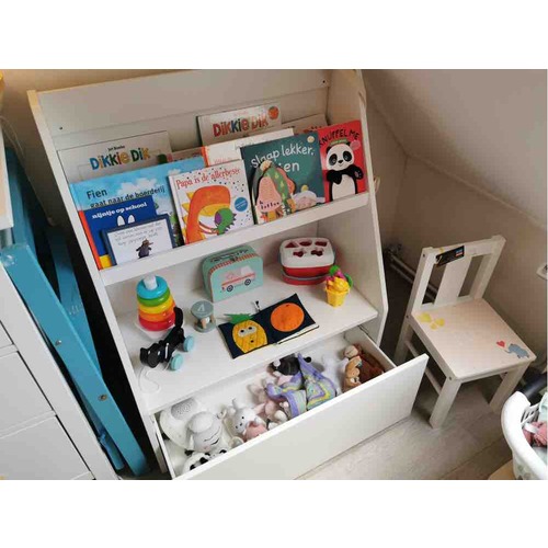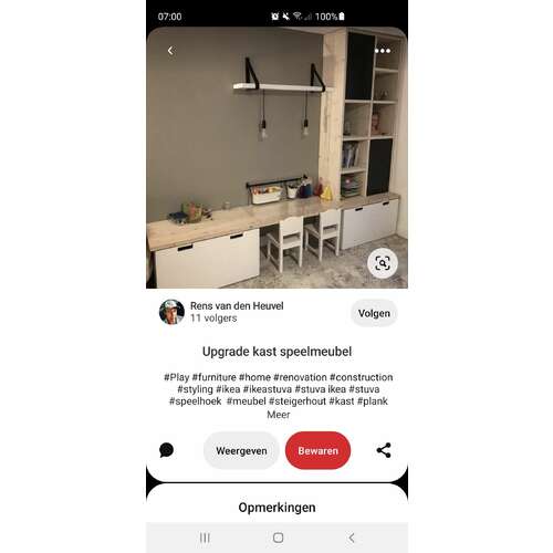 Ik heb bij de ikea 2 stuva speelgoedkisten (nu heet het smastad geloof ik) gekocht. Ertussenin staat dan alleen een stuva bankje zonder bak en daar staan stoeltjes onder. In de stuva bakken heb ik trofast opberg dozen. Ik heb al een peuter rondlopen dus veel speelgoed. Op pinterest staan leuke ideeën hiermee zoals deze foto.