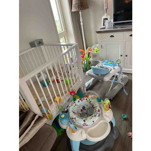Hier ook de baby walker en een bal daar kruipt hij hard achteraan en doet dan poging tot pakken en gooien