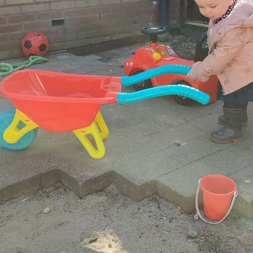 Ouders en schoonouders hebben gigantische tuinen. Daar zijn ze vooral bezig met ontdekken. Klein kruiwagentje/loop wagentje erbij en vooral die van 15 maanden heeft eindeloos plezier met rondlopen, takjes zoeken, grindsteentjes verzamelen. Qua speelgoed is er daar nog weinig nodig. Ze hebben wel een glijbaantje en er liggen wat ballen. In de zomer spelen ze graag met water. Onze oudste dochter vindt opblaasbadjes eng 😅 dus vaak gewoon wat bakken met water, wat plastic speelgoed erin en lekker flodderen. Oh en we zetten altijd een speelgoedtipi neer in de zomer, zodat ze uit de zon kunnen spelen. Deze zomer breiden we het speelhuisje uit met een (modder)keukentje.