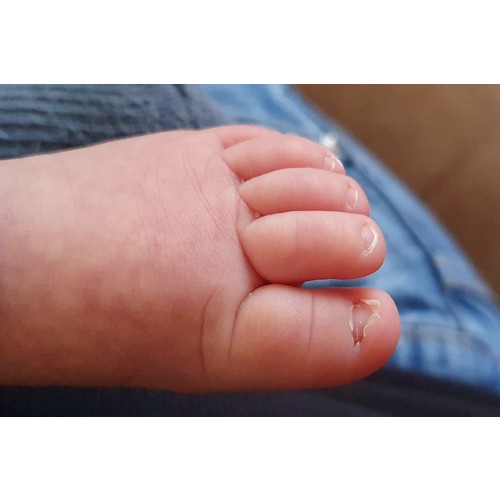 Hier was dit ook. Ik zag het met 4 weken toen we bij CB waren. De kinderarts daar zei dat we die nagel dan iedere dag moesten insmeren met vaseline. Hoewel ik het soms even vergat, is het nu uiteindelijk weer redelijk goed.