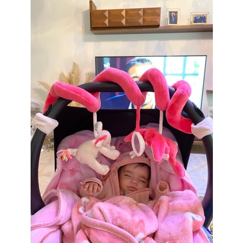 Zelfgemaakte wagenspanner. Zit vast met clipjes waardoor die ook bij de maxicosi vast kan. Kleine man kan er de hele tijd naar kijken tot hij van vermoeidheid in slaap valt.