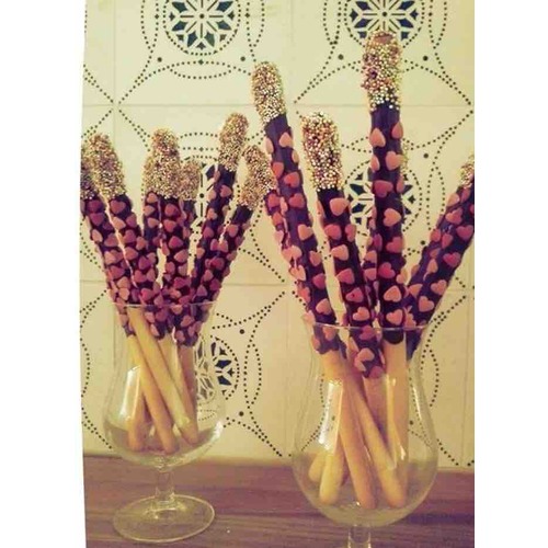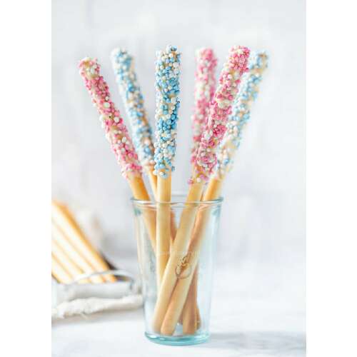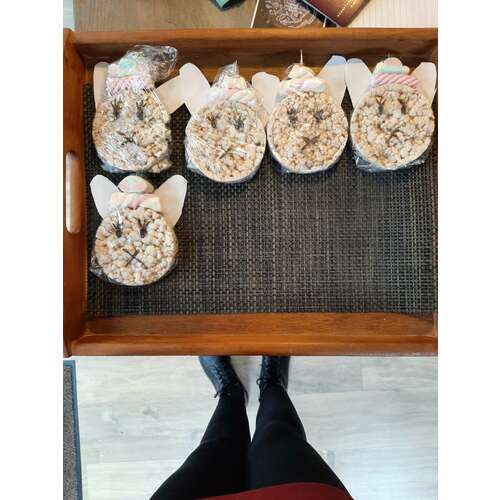 Lastig hè, en t moet eigelijk voorverpakt zijn 😫. Het word je er qua traktaties niet echt makkelijk op gemaakt. Wij maken soepstengels met chocola. Is niet van te voor te maken maar ik kijk de kraamverzorgster gewoon lief aan 🤣. Of partner of familie. Tis heel snel en simpel te maken. Ik voeg ff een foto bij