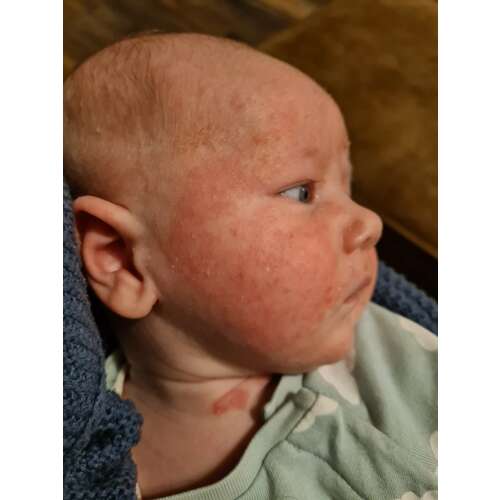 We zijn vorige week maandag helemaal op kunstvoeding over gegaan (daarvoor half om half) en sinds dinsdag dronk hij z'n flessen niet meer leeg. Eerst maar de helft en daarna ietsje meer maar denk 100 a 150 ml te kort en erg onrustig. Hij komt ook niet meer voor voeding en daarna kwam ineens deze uitslag erbij en toen was het weekend dus we moesten tot maandag wachten. Eerst contact gehad met CB maar hadden een zieke arts dus naar onze eigen huisarts geweest. Vandaag nog overleg gehad met kinderarts van CB. Smeren nu zalf en gaan over naar de pepti. Gelukkig wel genoeg gegroeid dus daarover geen zorgen!