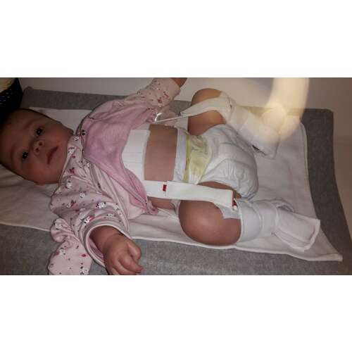 Hier mijn dochter. Het is helemaal goed gekomen. Ze had een redelijk erge afwijking. Soms vond ik het wel zielig voor haar. Vooral met het warme weer. Maar ik vermoed dat zij er vrij weinig last van had. Gewoon lekker in een rompertje laten of jurkje aan. Later kreeg ze er 1 met meer bewegingsvrijheid. Ze werd creatief met dat ding aan. Kon op een gegeven moment zitten en op haar billen schuiven. Met 2 jaar zette ze haar eerste stapjes. Daarna op peutergym gegaan zodat ze haar lichaam leerde kennen. Ik vond het soms wel lastig als mensen niet wisten dat ze een spreidbroekje aan had en zeiden; zo die zit er relaxed bij. En dat je kinderen ziet lopen en de jouwe zit nog steeds op je heup. Maar het is allemaal goed gekomen. Heb je specifieke vragen?