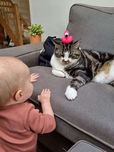 Als ik de hele grond vol leg met zijn speelgoed gaat hij toch richting de bank waar de kattenspeelbaan ligt om daar mee te spelen. Samen met onze poes 😛 win win want je kat is er ook blij mee haha
