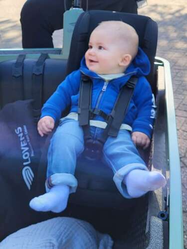 Wij hebben de Lovens bakfiets en onze baby zit in een peuterschaal 7 t/m 18 maanden. Is breder en ondersteund alles goed. Mijn zoontje is 10 maanden en zit er echt top in.