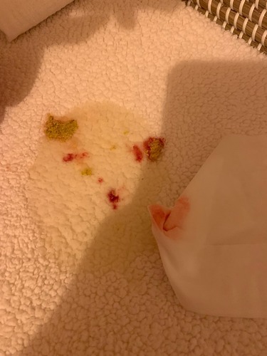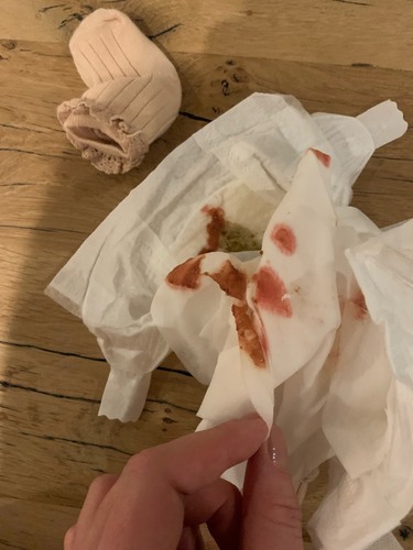 Bedankt voor je berichtje. ☺️Veel herkenning als ik het zo lees. Vandaag toevallig weer naar de SEH geweest. Tijdens het verschonen gutste het er weer uit en konden het niet meer aan zien (zie foto). Zo erg om te zien dat er bloed uit zo’n klein mini lijfje komt. Ze is wederom onderzocht door de kinderarts en is bloed geprikt. Haar waardes en HB waren goed. Ze denken hier ook aan een koemelk allergie. Wij hadden eerst Pepti voorgeschreven gekregen bijna een week geleden, maar hebben sinds vanavond nu ook de Nutramigen voorgeschreven gekregen. Hopelijk doet dit z’n werk..
