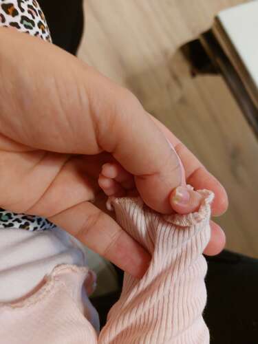 Mijn dochtertje heeft al sinds haar geboorte drie ontstoken vingertjes. Tijdens een bezoek aan het ziekenhuis (voor iets anders) adviseerde de kinderarts om het met elke voeding even schoon te maken met water en verder niks te doen. Sindsdien zijn twee vingertjes al genezen. Ze lijkt overigens geen last te hebben van de vingertjes want ze reageert niet als ik er aan zit.