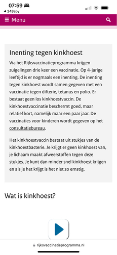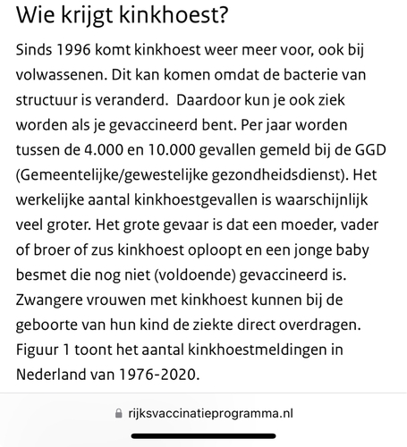 T/m vorige week was het met vlagen nog echt vervelend. Ze heeft het heeel heftig gehad. Blauw aanlopen, ademstops, heel vaak spugen door het hoesten. Elke nacht trok ik haar uit haar bed om haar door de hoestbuien heen te helpen, sws wel 1-2 keer per uur! Goodbye sleep, hello traumatische ervaring. Ik vond het echt heel erg eng en niemand stuurde ons door of dacht überhaupt aan kinkhoest t/m een maand geleden ong. Ik ben toen getest via bloed en kwam positief uit. Toen waren we dus al 2 maanden bezig. Ik kreeg het 2 wkn post partum en mijn dochter was 3,5 wk oud toen zij het ook kreeg. Dus niet gevaccineerd. En bij jullie?