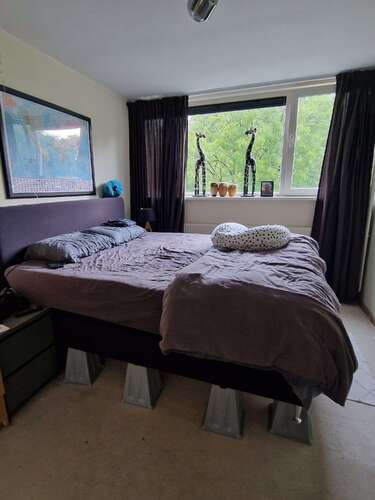 Ik heb "lagere" bed klossen besteld, die zijn ook wat kleiner dan die hele grote, omdat wij ook een boxspring hebben maar die heeft 16 poten, dus die grote waren te breed, hebben nu kleintjes eronder van 7cm waardoor alles in totaal 85 cm hoog is!