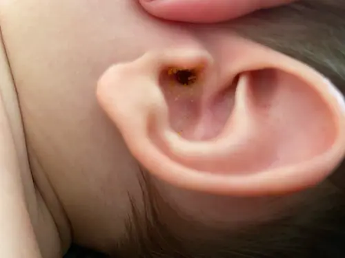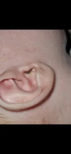 Dit was zowel bij onze oudste als onze dochter van nu 7 maanden ALTIJD een loopoor/oorontsteking (zie foto). Onze zoon is nu 3 en had gemiddeld 8/9 keer per jaar een kuur nodig om er bovenop te komen. Begin met een vies oor, maar hij liep nooit/,knapte nooit volledig dus altijd druk achter het trommelvlies. Hij is 8 weken geleden geopereerd: neusamandel eruit en buisjes en is een compleet ander kind ❤️. Hier lang niet altijd koorts en toch echt flinke ontstekingen! Onze dochter heeft ook al haar 5e kuur te pakken en wordt na haar eerste verjaardag ook geopereerd. Wij zitten nu ook weer met dit zelfde verhaal en was hier opnieuw een ontsteking. Kijken in de oortjes bij de huisarts is zo gepiept! Zal het voor het weekend wel laten checken, het wordt heel warm en als het een oorontsteking is dat erger en erger wordt dan gaan ze vaak ook slecht drinken en doet plat leggen veel pijn❤️