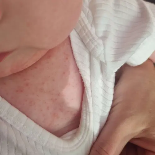 Het ziet eruit als warmteuitslag of irritatiebultjes, maar ik kan het niet goed zien. Is het wegdrukbaar?