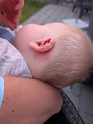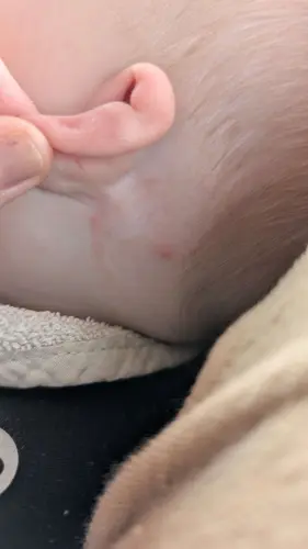 Ja zit wel een rode vlek maar hij begon in eens te schreeuwen. Hij had wel een muggen beet maar geen vlek en nu in eens een vlek