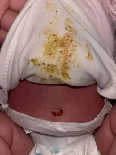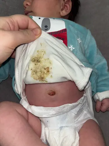Hoe is het nu? Bij mijn dochter heeft er ongeveer nog 24 uur wat ‘donker’ vocht uit gelekt. Mij werd ook geadviseerd een tissue tussen de luier en haar romper te houden. Na 24 uur was het wel over.