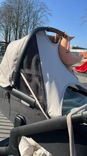 Onze zonneklep van de wandelwagen kun je nog wat verder naar beneden doen als de rits los is