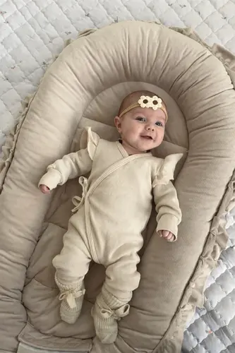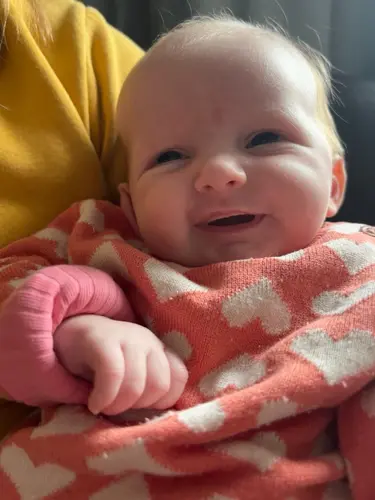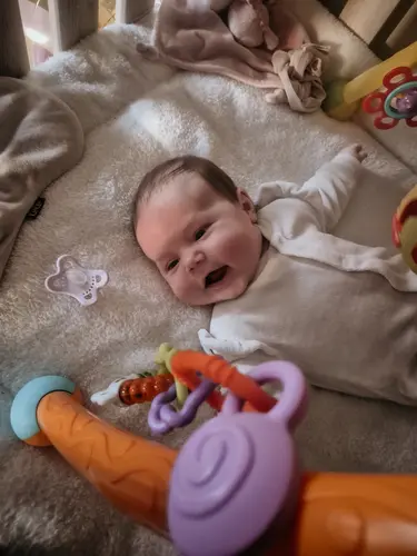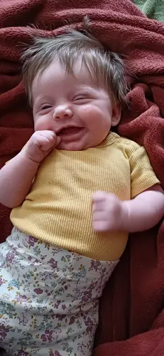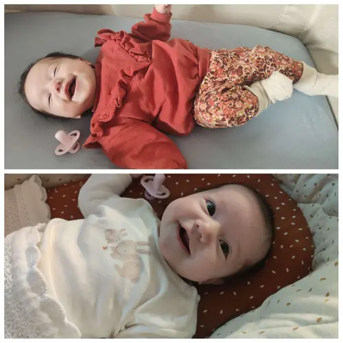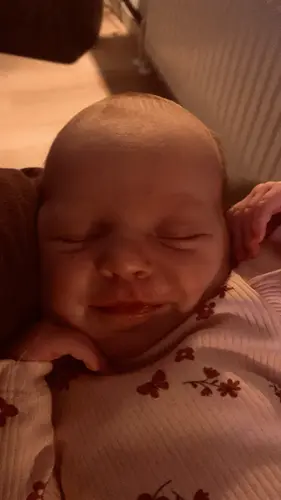 Onze kleine meid nu 5 weekjes oud, maar kijkt meer grumpy dan dat ze lacht 🫣dus deze had ik toch even mooi kunnen meepakken hoop nog veel van deze momentjes te mogen zien gebeuren Heerlijk 🥰😍
