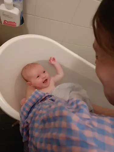 Eindelijk een lachje van Teddy (6 weken) op de foto vast kunnen leggen 🥰 Ze is gek op badderen en douchen.
