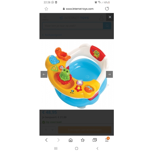 Een badzitje van vtech met leuke beestjes en muziekjes erop echt ideaal zit goed vast op de vloer dus ze kunnen lekker wild doen zonder om te vallen en jij hebt je handen vrij. Ons 3e kind al wat ik zo doe.