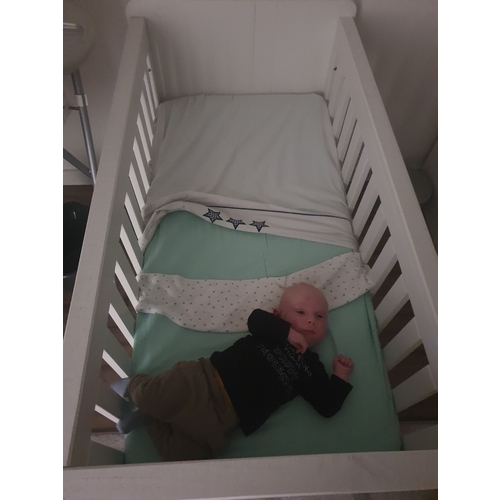 Hier begon mijn zoon mee toen hij 9 weken oud was. De eerste keer dat hij horizontaal kwam te liggen stootte hij zijn hoofd maar nu draait hij z'n hand er niet meer voor om. Het is elke ochtend weer een verrassing hoe we hem in bed aantreffen. Heb gewoon de dekens eruit gehaald en nu kan hij wat mij betreft vrij z'n bed door.