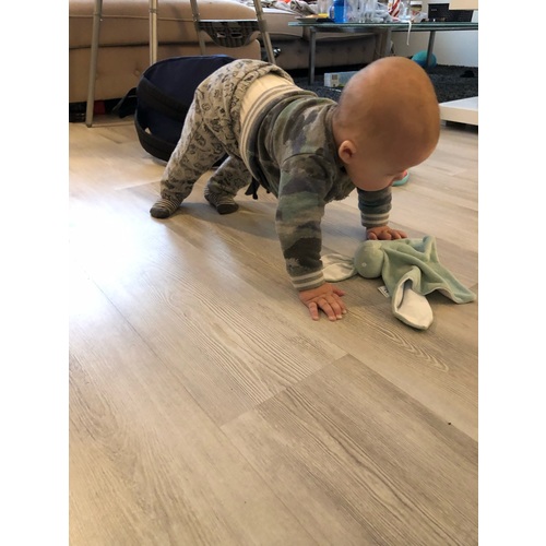 Ja wij hebben een schuimmat, hij gaat er vanaf. Ook anti slipsokken, meneer gaat niet op knieen maar op handen en voeten馃槀
