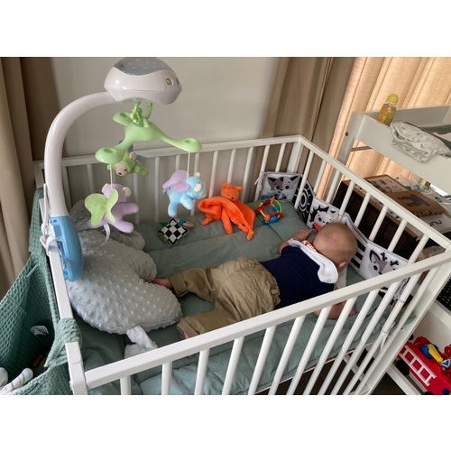 Onze dochter is dol op de mobile in de box. Als ze het beu is in de box leg ik haar op een kleed in de kamer of onder haar gym. Ik wissel een beetje af om haar bezig te houden :-) en als ze niet in de box ligt ga ik even bij haar zitten als het kan. Ze is dol op luisteren naar verhaaltjes dus dan kletsen we wat.