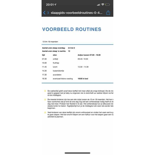 Om 7:00 krijgt hij borstvoeding en daarna rond 7:30 brood. Na zijn eerste slaapje om 10:00 fruit met thee en om 12:00 brood met melk, dan na de middagslaap borstvoeding en rond 15:30 een klein tussendoortje, 17:00 avond eten en voor het slapen nog een voeding. Ik wil wel het borst voeden gaan afbouwen als de melk tussen de middag goed gaat.. ik heb een foto toegevoegd van het schema wat ik volg 😊. Mijn zoontje slaapt nog wel in de co sleeper maar slaapt sinds het inkorten van de slaapjes helemaal door..