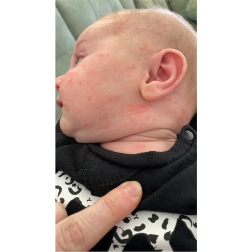 Mijn zoontje had het eerst over z’n hele lichaam. Nu alleen nog een beetje in z’n gezicht en dat op z’n lichaam trekt ook weg. Kinderarts zei dat dat kan over de hele lijf. En leek erg op babyacne. M’n oudste zoon had het ook. Dus ik was er wel bekend mee. En nu weer. Plus ik eet koemelkproducten vrij. Dus kan geen allergie zijn.