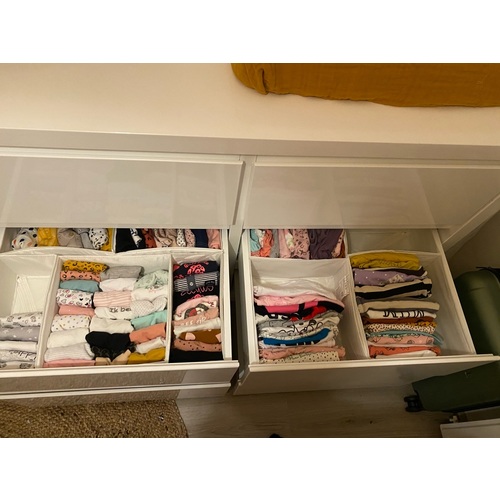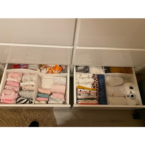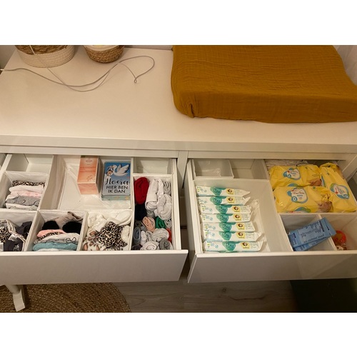 Deze heb ik ook maar dan in mintgroen in alle laden. En heb sommige dingen ook opgehangen zoals jurkjes en onesies. Maar broekjes, truitjes, rompertjes, sokjes gaan allemaal opgevouwen in deze ladeverdelers, met labels erop met maten om het m’n man ook makkelijker te maken 👍