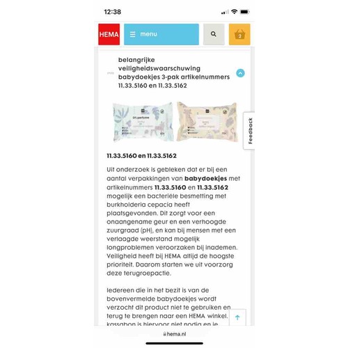 Ik heb ze vrijdag teruggebracht bij een nogal chagrijnige dame, ze wist niets van een terugroepactie en vroeg dus om een bon, deed erg moeilijk. Op een gegeven moment had ik door dat ze een fout maakte, ze boekte de doekjes per pakje terug, ipv per 3 pakjes tegelijk. Wilde haar daarop attenderen, maar ze reageerde direct weer chagrijnig.dus toen dacht ik dan zoek je het maar uit.