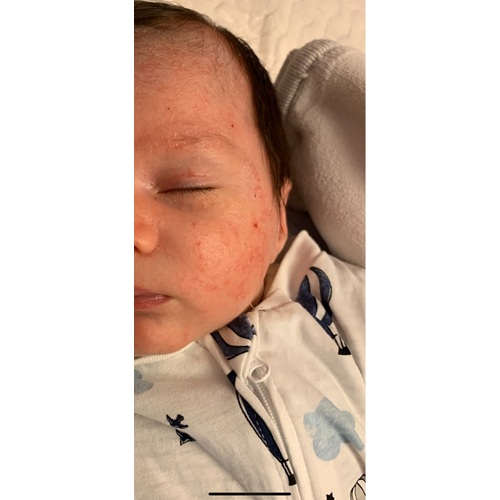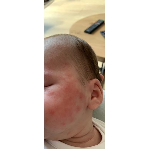 Mijn zoontje had eerst wat jou zoontje heeft op de foto daarna werd het dit en nu soms met vlagen weer zoals op jou foto. CB zei tegen ons baby acne maar een heftige vorm waarschijnlijk een gevoelige huid, ik smeer sinds 3 dagen op zijn wangetjes crème van naïf omdat het heel droog aanvoelde en het word wel minder..