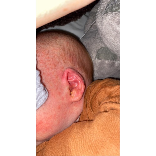 Let ook op zijn oortje er zijn gele korstjes op en hij huilt ook meer ..