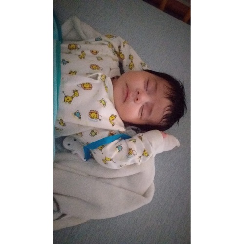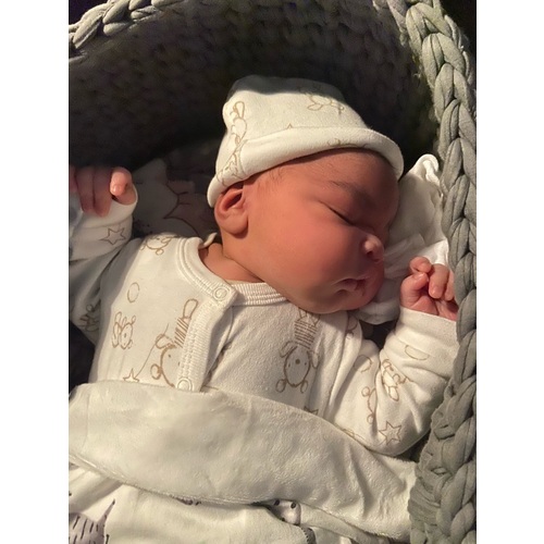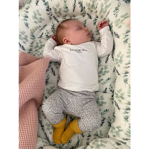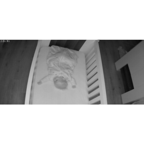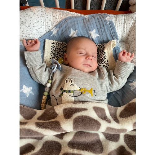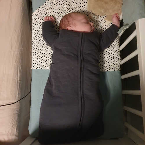 Hij sloeg zichzelf alleen wel wakker, slaapt sinds hij 1 week is in de Love To Dream slaapzak, lekker geborgen en handjes liggen naast z'n hoofd