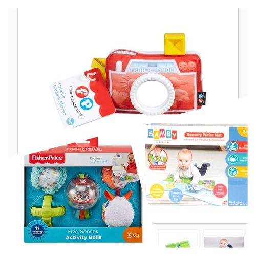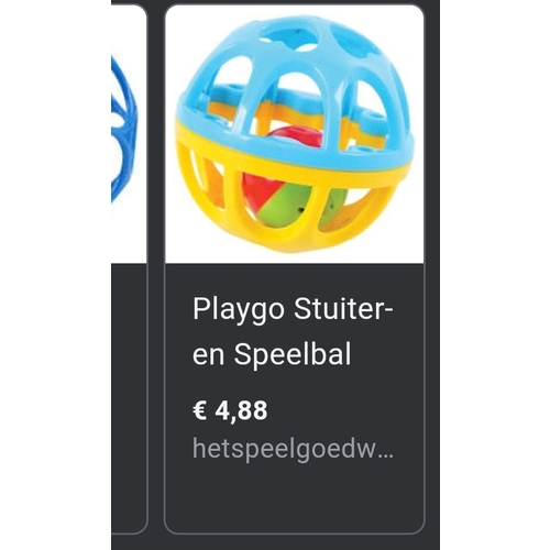 Gatenbal dus grijpspeelgoed in allerlei vormen. (Laatst bij de wibra €1 p.s.) Knisperboekjes.