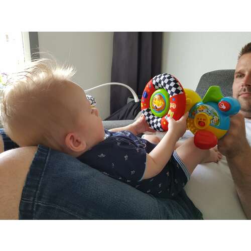 We hebben een piano tegen de wand van de box aan waar die lkkr tegen aan kan trappelen. Je hebt 3 standen, piano dierengeluiden of muziekjes