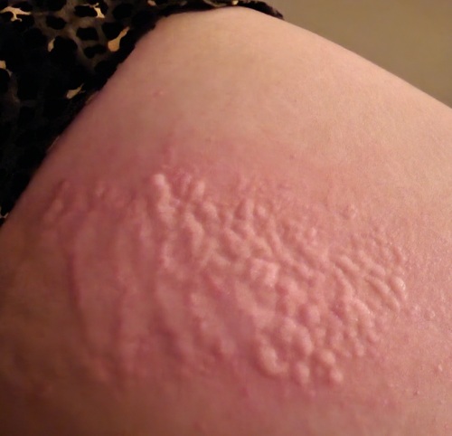Dit lijkt een best wel veel op netelroos. Dat is ook een allergische reactie en kun je zelfs door stress op komen zetten. Maar ook weersverandering, wasmiddel, eten, noem maar op. Misschien even langs dokter?