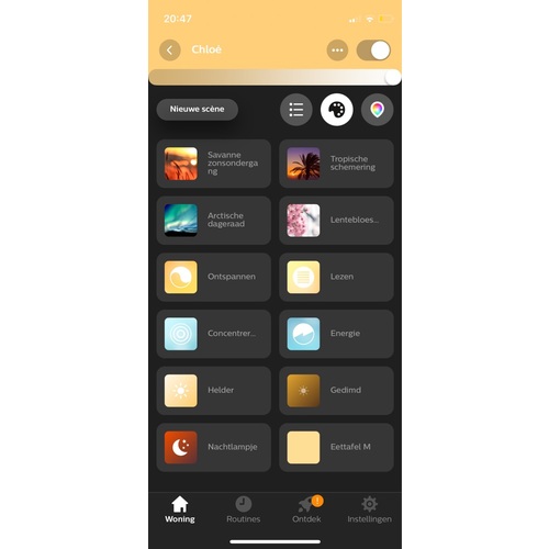 Wij hebben een Philips Hue lamp in haar grote lamp. Naast de voorgeprogrammeerde sferen kan je ook zelf kiezen uit alle mogelijke kleuren en je kan zelf de felheid regelen. Aan/uit met de knop aan de muur is altijd op de laatste stand wat je hebt gebruikt, als je van kleuren wil veranderen moet dat met de app op je telefoon. Je kan het ook met de timer instellen wat misschien voor later weer top is, als alle lichten op een vast tijdstip uitmoeten 馃槈