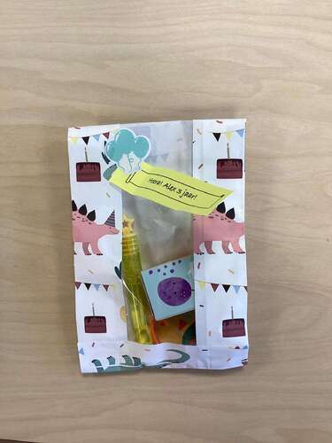 ik heb een zakje met kleine bellenblaas en puzzeltje (beide van de Hema) met een doosje krentjes gedaan. in een leuk papieren zakje. voor ieder kind wat leuks
