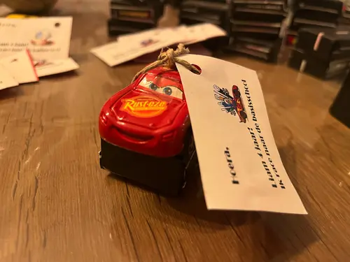 Creabea bezig met een rozijnen doosje met daarover weg tape en een cars auto. Als ik het aan het maken ben denk ik bij mijzelf, waarom?! Maar ik denk dat mijn zoontje straks super trots is om dit te trakteren!