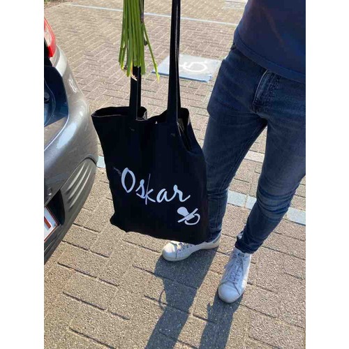 Van onze buurvrouw kregen we een leuke tas gepersonaliseerd (kijk foto). Deze gebruiken we als luiertas als we maar even weggaan. We hebben een groot exemplaar voor de lange uitstapjes. Maar deze tas is écht een topcadeau!
