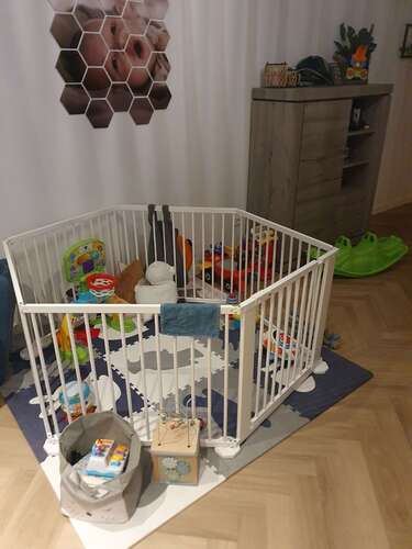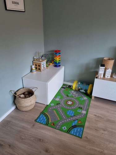 Ik woon in een appartement dus heb ik zelf wat ruimte moeten creëren. Ik heb de eettafel tegen de keuken gezet zodat ik van die ruimte de speelruimte kon maken, de speelbox wilde hij niet meer in dus heb ik die weg gedaan. Heel leuk dat jullie het leuk vinden🤩