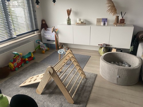 Voor nu is het dit hoekje met variërend speelgoed en de klimboog die midden in de kamer staat 😂