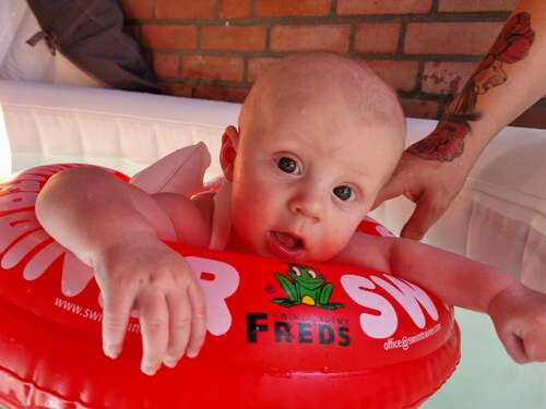 Wij hebben zo’n opblaas zwembandje voor om de nek. Vind hij geweldig! Ging echt al zelf een soort zwemmen door met z’n benen te trappelen.