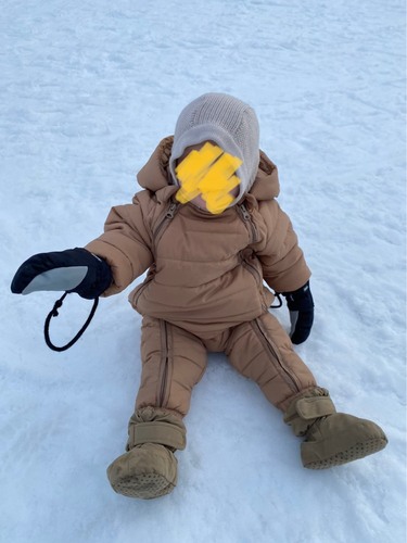Wij hebben ze van H&M bijpassend bij ons skipak. Eerst de handschoenen aan en dan het pak erover. Dan blijven ze goed in de mouwen zitten. En inderdaad een goede draagzak voor als het met de kinderwagen niet goed begaanbaar is