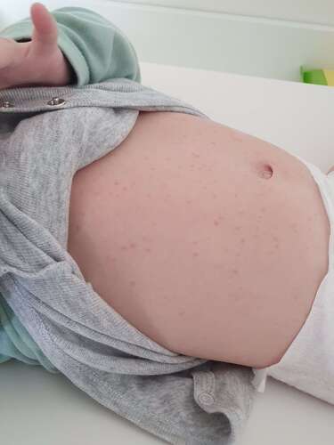 Hier een foto van zijn buik. Dit was de dag erna een stukje erger en na een paar dagen dus helemaal weg.